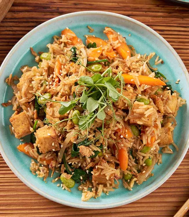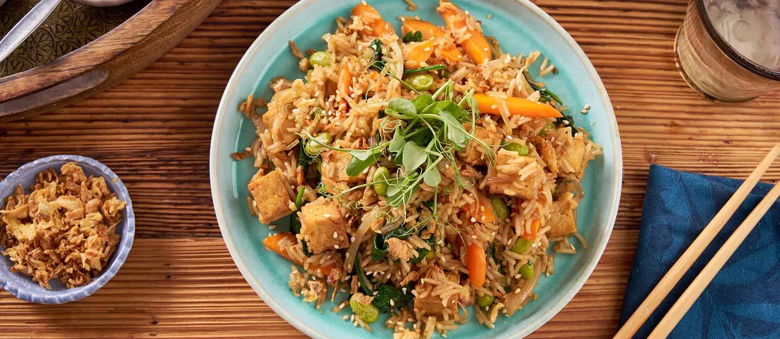 Arroz frito com tofu e molho teriyaki