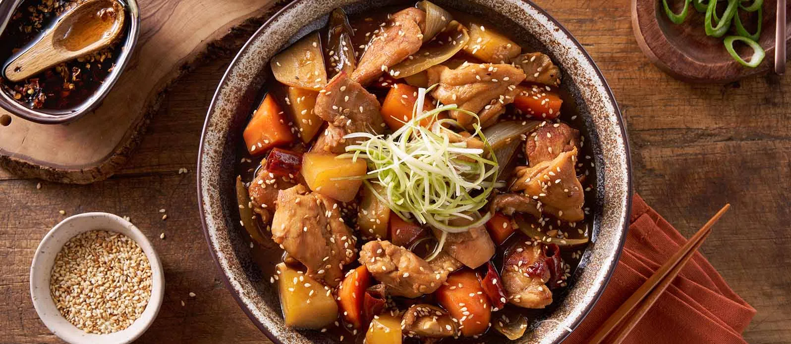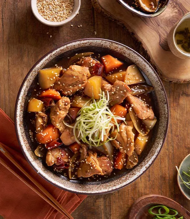 Coxas de frango tenras refogadas com legumes em Molho de Soja Kikkoman e finalizadas com Óleo de Sésamo Kikkoman. Um molho espesso e brilhante e uma cobertura crocante de sementes de sésamo e cebolinhas conferem-lhe um sabor coreano distinto.