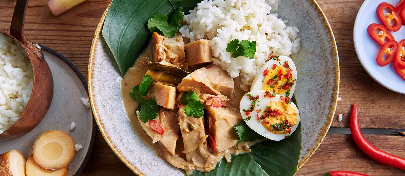 Guisado: Misture a galanga, a erva-príncipe, o açúcar de palma, as sementes de coentros, as chalotas e o óleo até formar uma pasta. Salteie a pasta durante 3 minutos, deixe ferver com o leite de coco e adicione os saquinhos de chá durante 1 minuto. Retire os saquinhos de chá e adicione a jaca escorrida e as folhas de lima. Reduza durante cerca de 10 minutos e tempere a gosto com Kikkoman ponzu limão.