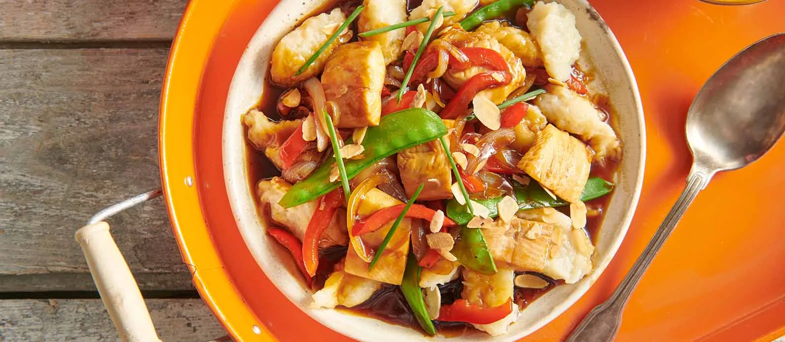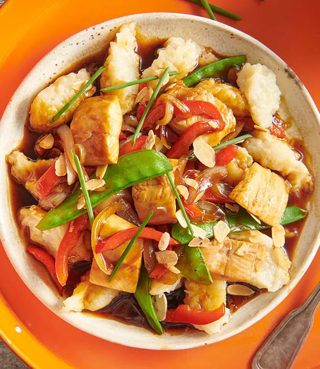 Este prato está enraizado na Europa de Leste. Aperfeiçoámos o spaetzle de batata com o molho teriyaki Kikkoman Wok para um toque aromático, doce e picante.