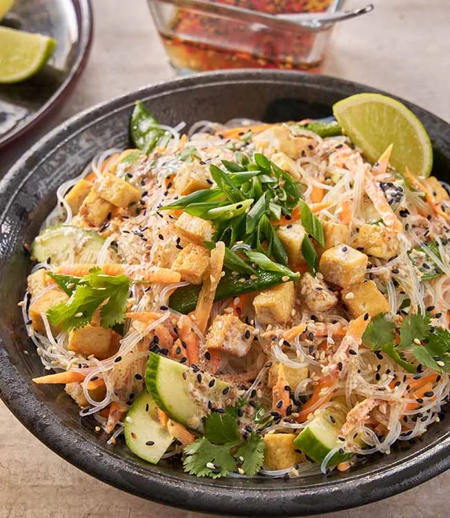 Um prato leve e aromático de noodles de arroz com tofu fumado, legumes crocantes e Molho de Sésamo Kikkoman, repleto de sabores e texturas contrastantes.