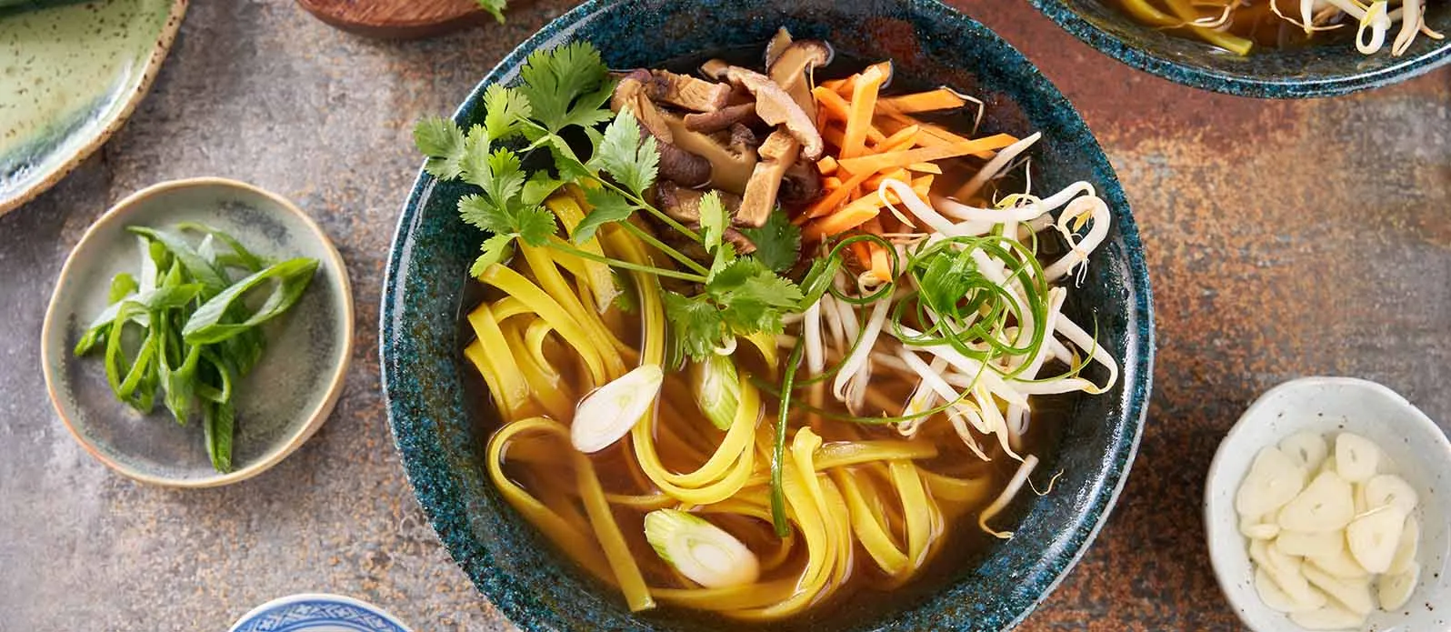 Pho vegetariano aromático com tofu, cogumelos shiitake e legumes frescos num caldo perfumado com anis estrelado, cardamomo e gengibre. Leve, saudável e cheio de umami com o Molho de Soja Kikkoman sem Glúten.