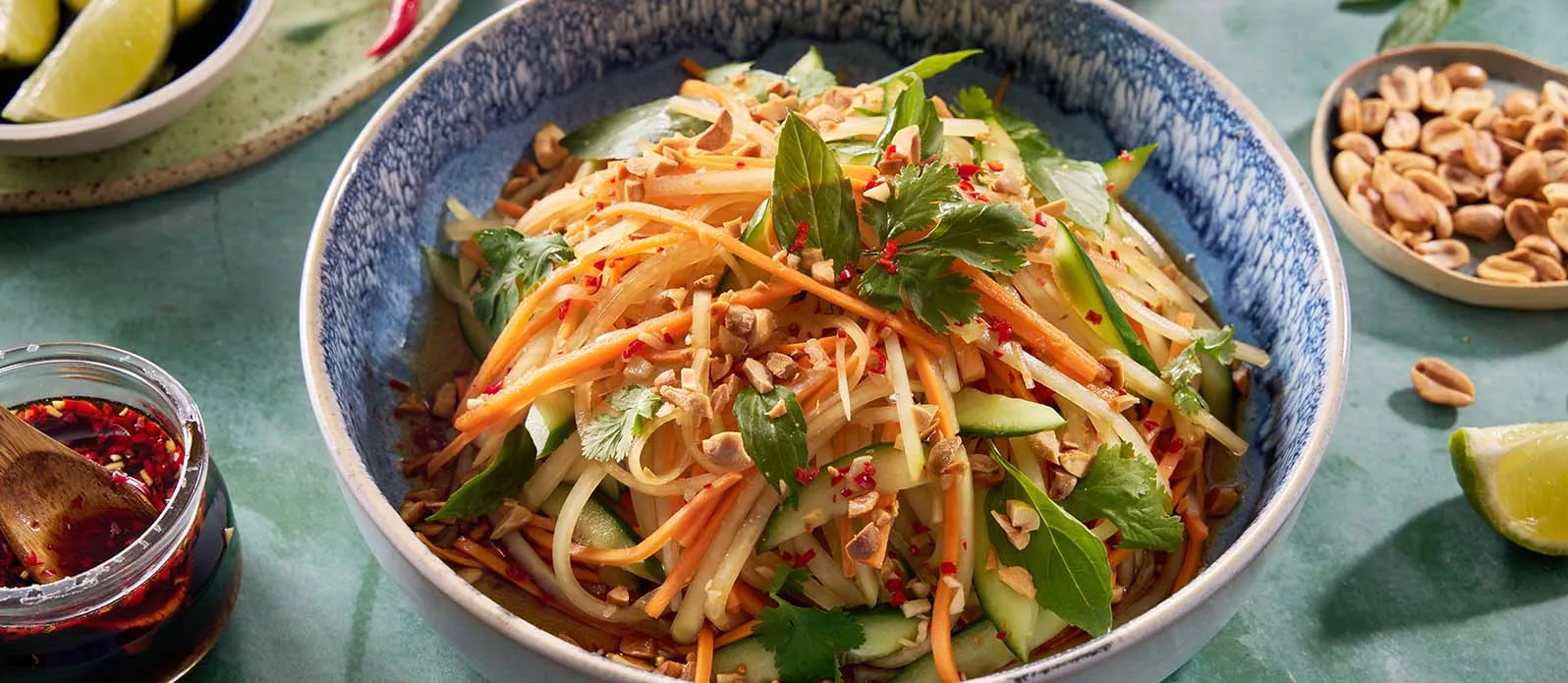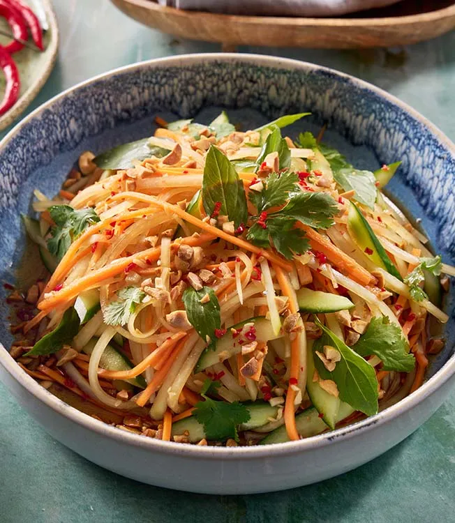 Uma salada leve e refrescante de papaia verde ao estilo tailandês, com um molho perfumado feito com Kikkoman Ponzu Limão e açúcar de palma, coberta com amendoim crocante, coentros e manjericão para um toque final aromático e crocante.