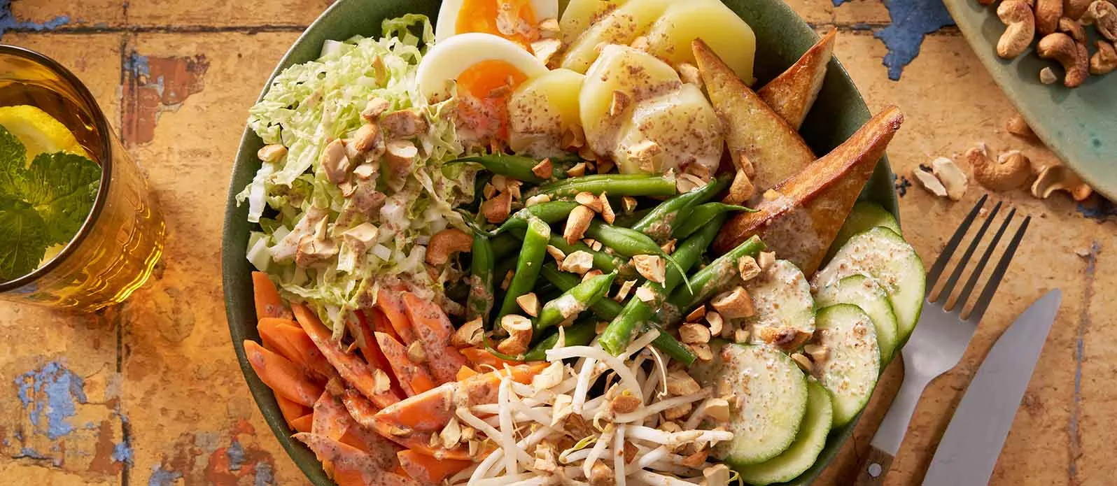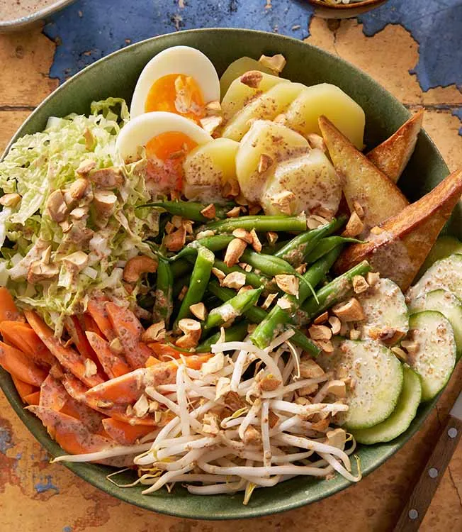 Salada gado-gado da Indonésia, regada com o aromático Molho de Sésamo Kikkoman. As nozes conferem crocância e um sabor característico.