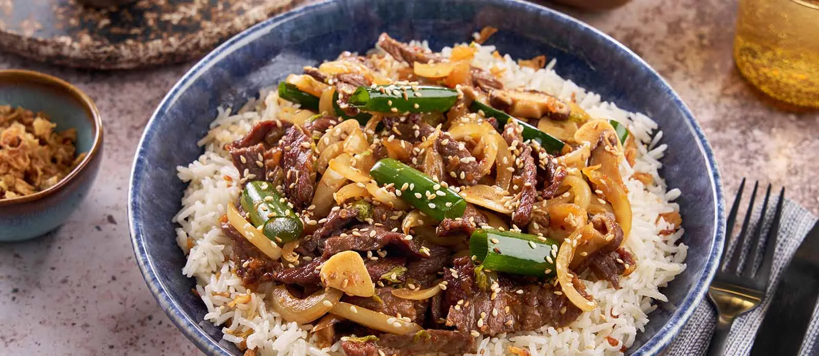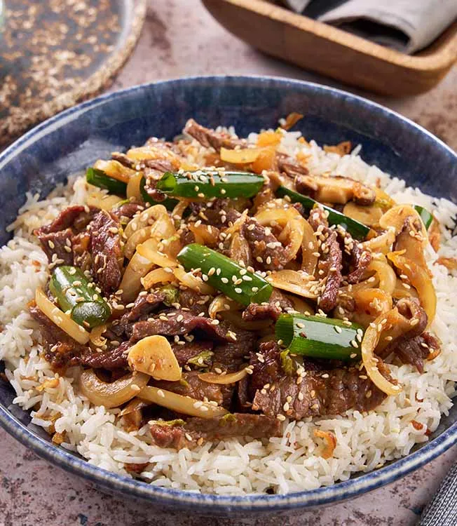 Carne tenra salteada com cogumelos shiitake e kimchi em Molho de Soja Kikkoman Sem Glúten. A carne suculenta e o sabor intenso do umami são realçados pelo sésamo torrado e pelas cebolinhas, criando um prato delicioso e reconfortante.