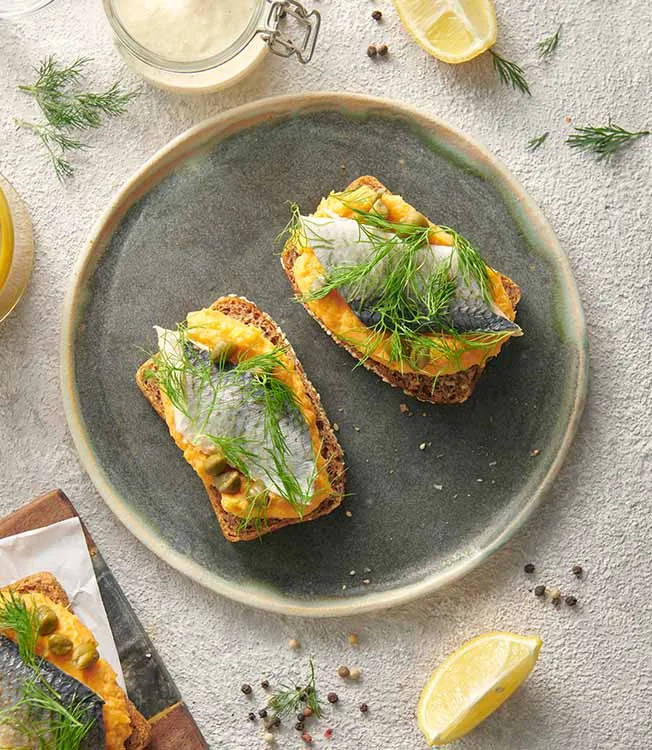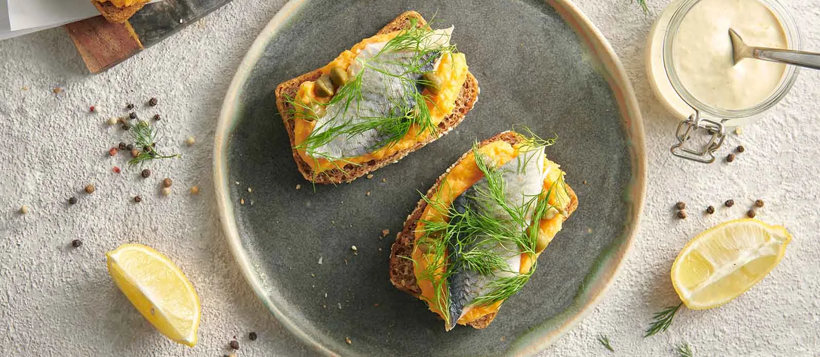 Espalhe a mousse de batata-doce nas fatias de pão torradas. Cubra com os filetes de arenque e regue com o molho de rábano e as alcaparras. Decore cada fatia de pão com um ramo de endro e um gomo de limão.