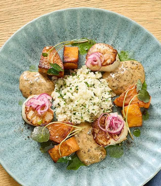 Vieiras salteadas na frigideira acompanhadas por um “cuscuz” de amêndoa e couve-flor, batata-doce assada e um sabayon de nori. O Molho de Soja Kikkoman com Menos Sal e o Tempero Kikkoman para Arroz de Sushi completam os sabores e conferem profundidade ao prato.