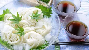 São muito finos, noodles brancos e longos feitos de trigo, sal e água. São mais finos que o udon. Somen é um prato popular em clima quente, quando é servido frio com um molho (dashi), molho de soja e gengibre fresco.