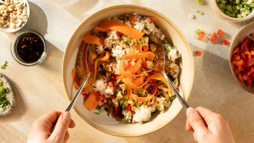 Experimente arroz frito com ovos e vegetais picantes, ou um classico como o nasi goreng.