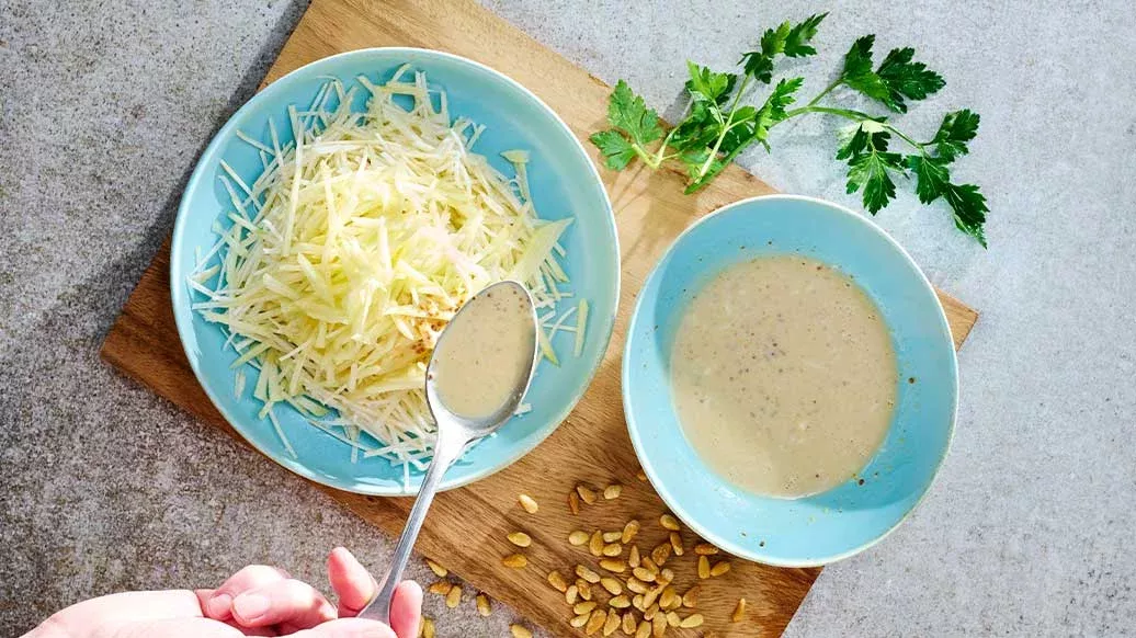 O aipo fica gourmet! Esta salada de raiz de aipo, ensopada numa marinada picante de ponzu yuzu, maionese cremosa e mostarda, é uma iguaria rica em umami e repleta de sabor.