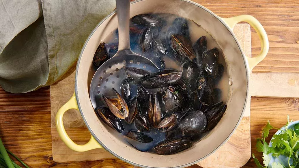 Coloque as amêijoas numa panela, cubra com água e coloque em lume médio-alto. Cozinhe até as conchas abrirem (cerca de 5-7 minutos). Escorra-as e deixe-as arrefecer durante 3-4 minutos. Em seguida, retire a carne das amêijoas da concha e reserve.
