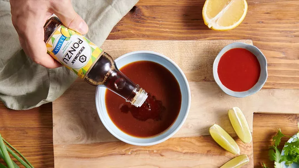 Misture todos os ingredientes: Kikkoman Ponzu, sriracha, ketchup, raspas de lima e limão - para criar um molho bem misturado.