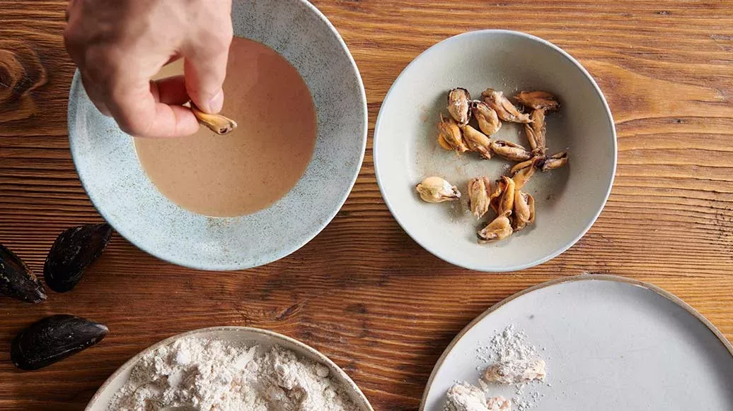 Agora, coloque as amêijoas na massa, misture bem e depois transfira para o resto da mistura seca. Certifique-se de que todas as amêijoas ficam cobertas com uma boa crosta. Frite as amêijoas em óleo pré-aquecido durante cerca de 2-3 minutos ou até ficarem bem douradas.