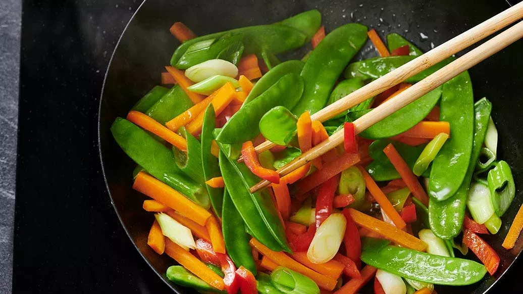 Aquecer 2 colheres de sopa de óleo num wok e saltear brevemente as cenouras e o pimento durante 2 minutos, mexendo sempre. Juntar as ervilhas doces e as cebolinhas e refogar durante mais 2 minutos. Tirar do fogão e reservar.