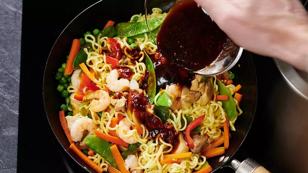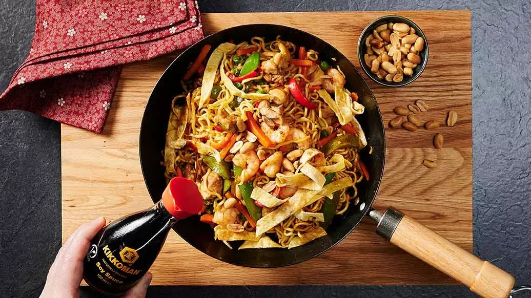 Variações: uma alternativa é Nasi Goreng, tradicionalmente preparado com arroz. Para vegetarianos, em vez de carne use tiras ou cubos de tofu ou mais legumes, como cogumelos, Pak Choi (couve chinesa) ou pimento vermelho.