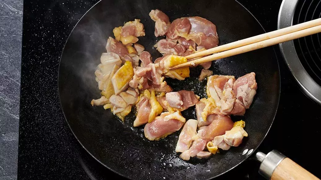 Aquecer mais uma colher de sopa de óleo no wok e saltear brevemente o frango durante 2 minutos, mexendo sempre. Adicionar os legumes refogados, as ervilhas, a massa e os camarões e juntar a marinada.