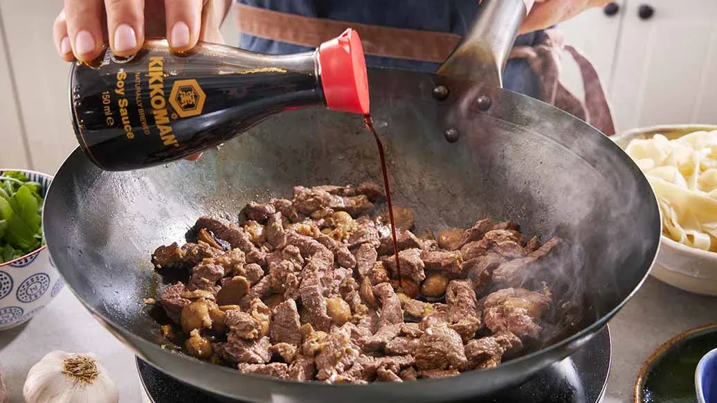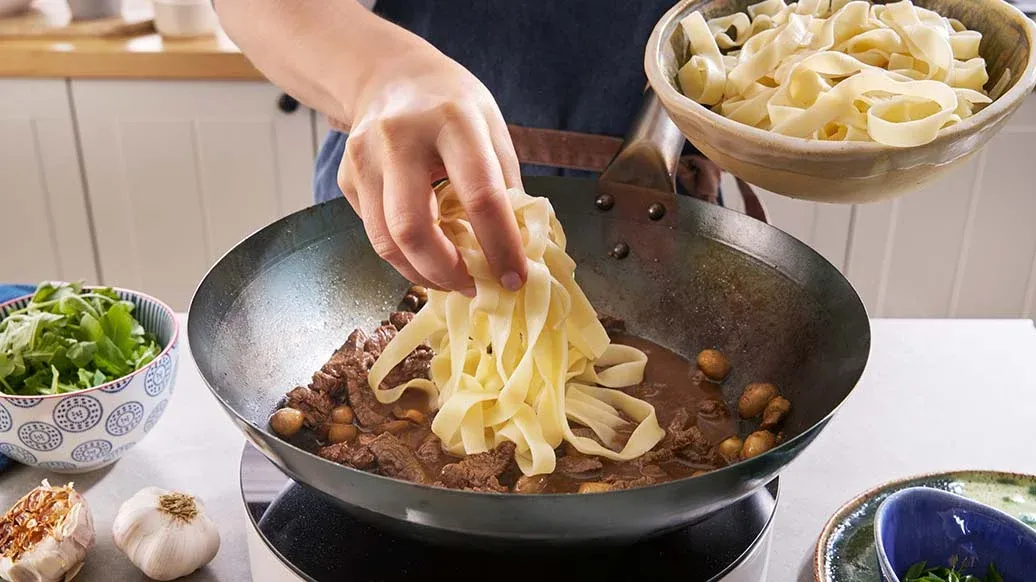 Um salteado rico e aromático, onde o Molho de Soja Kikkoman realça os sabores da carne tenra, do alho assado e dos cogumelos, criando um equilíbrio perfeito com o tagliatelle macio.