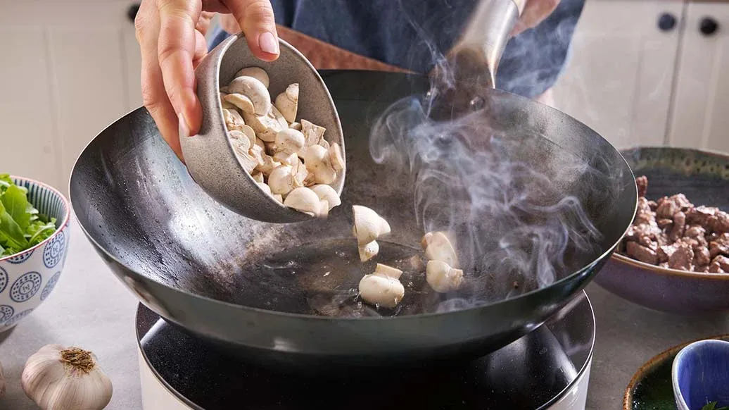 Adicione mais um pouco de óleo ao mesmo wok e salteie os cogumelos durante 3-4 minutos até ficarem dourados.