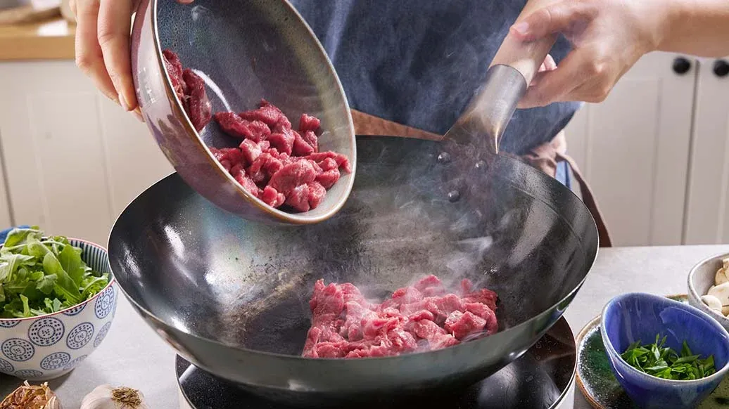 Aqueça um wok, adicione o óleo e a carne e salteie durante 2-3 minutos até dourar. Retire do wok e reserve.