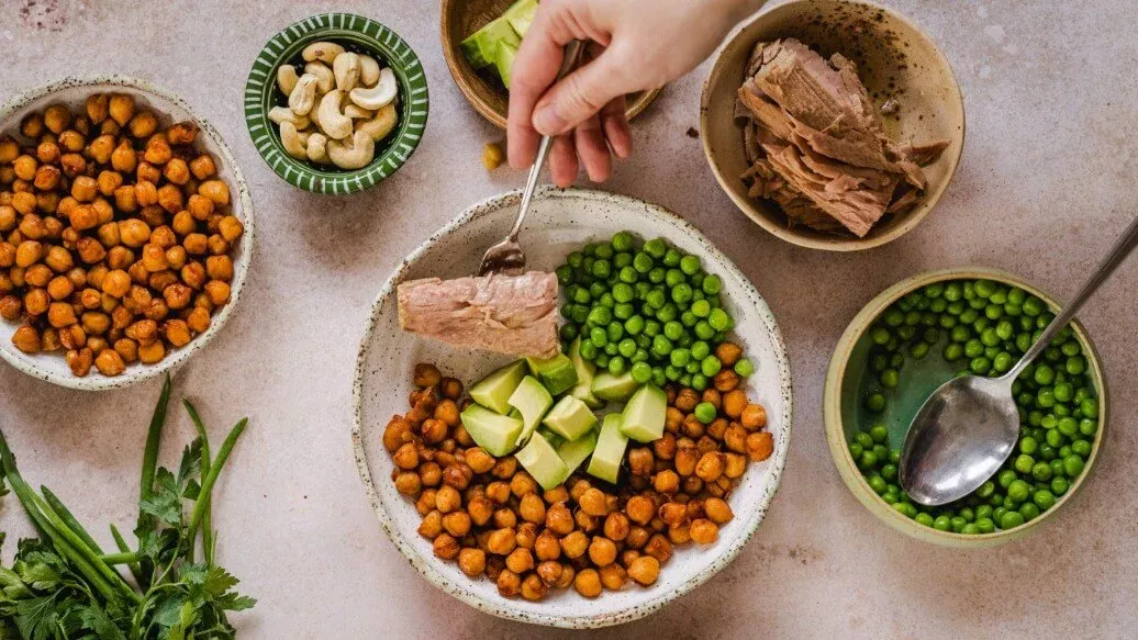 Adicione o abacate cortado em cubos, as ervilhas cozidas e o atum escorrido à tigela com o grão-de-bico caramelizado.