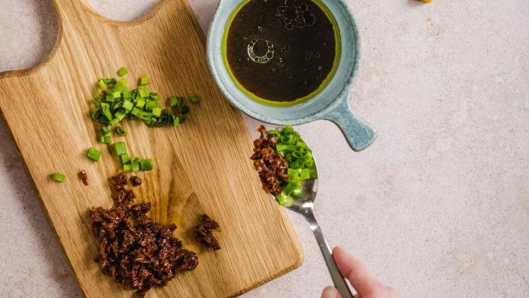1 colheres de sopa Kikkoman Molho de Soja Fermentado Naturalmente – 1 colheres de sopa de azeite – 2 colheres de sopa de sumo de lima – 2 colheres de sopa de tomates secos em óleo – 1 colheres de sopa de cebolinho picado – 2 colheres de sopa de cajus – Salsa para decorar