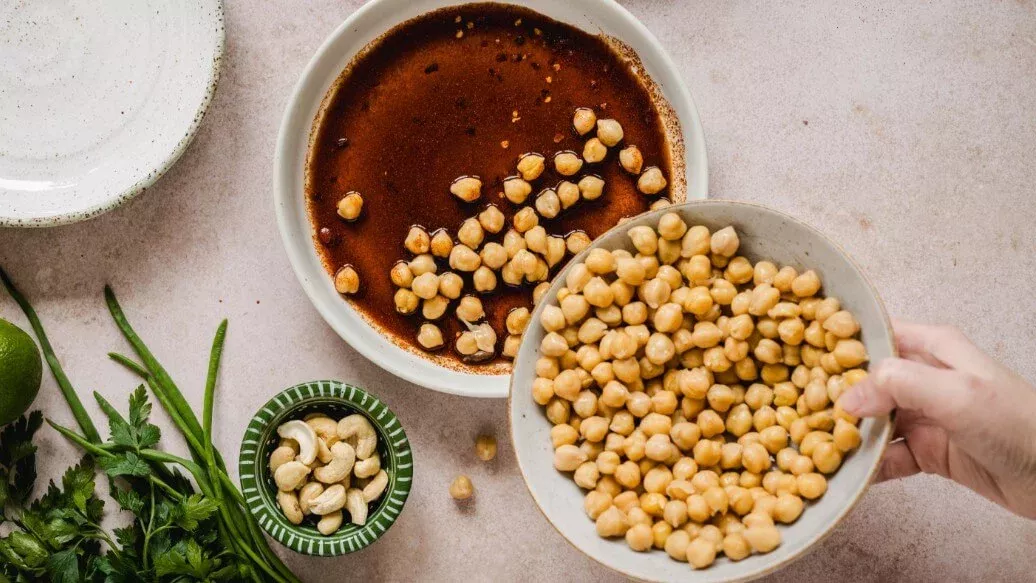Bowl com grão-de-bico caramelizado em marinada de teriyaki