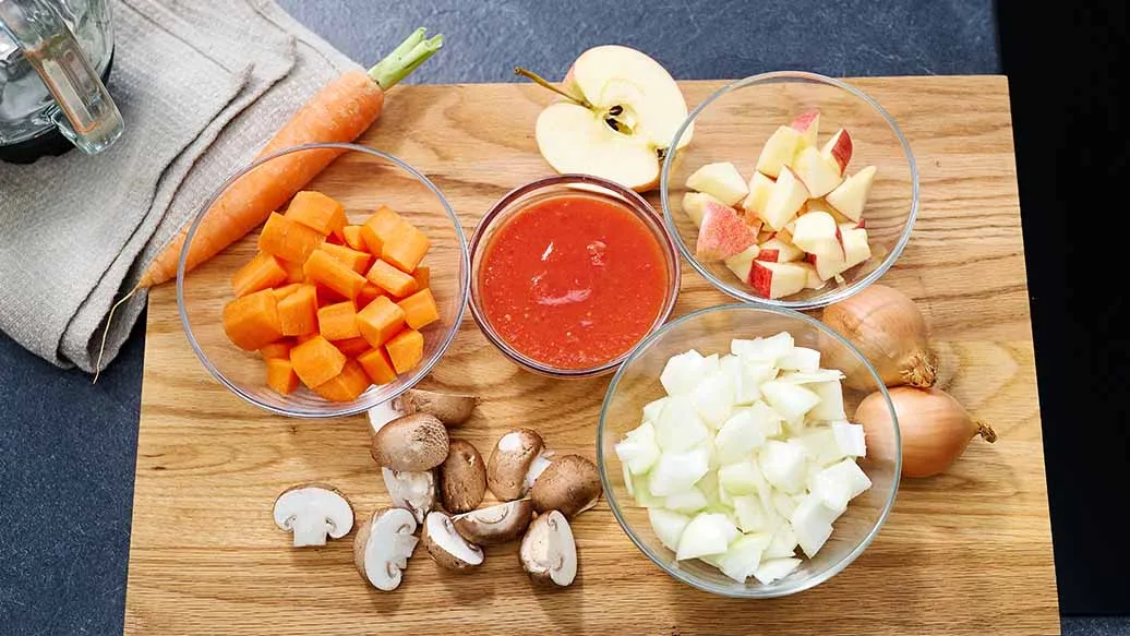 200 g de cebola – 150 g de cenoura – 6 cogumelos – ½ maçã – 150 g de tomate enlatado