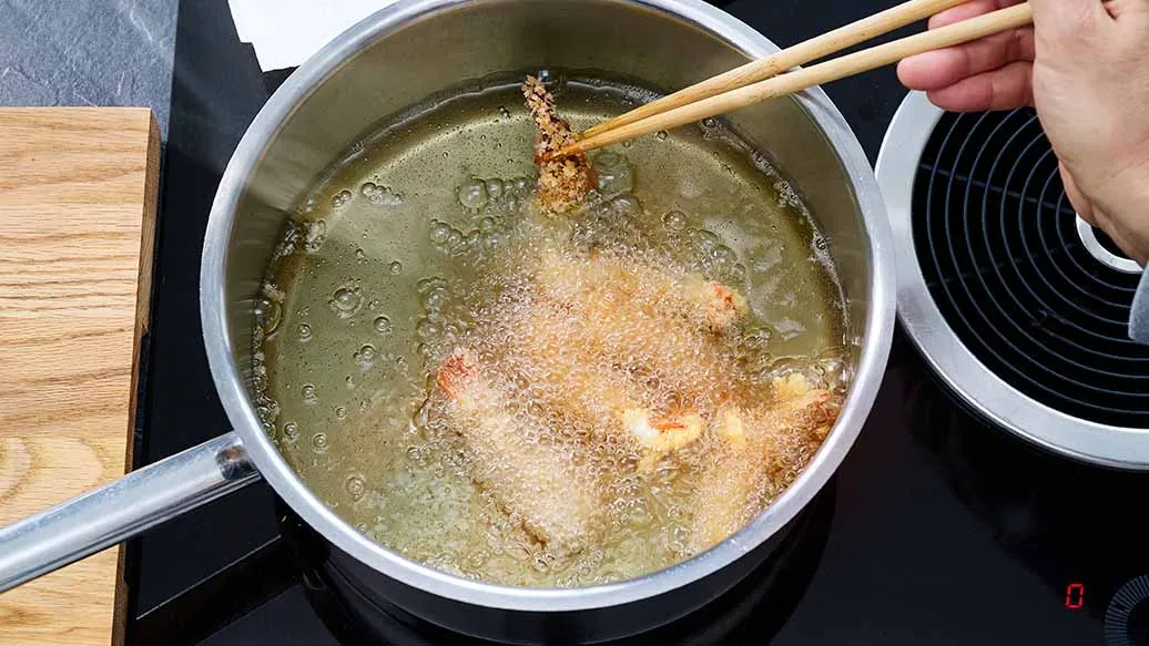 Corte a couve em fatias finas e deixe de molho em água fria por alguns instantes, depois escorra bem. Descasque os camarões, deixando as caudas, e remova a tripa. Seque com um pano, alinhe as caudas e faça pequenos cortes diagonais perto da extremidade da cauda para liberar a humidade e evitar salpicos de óleo. Faça cortes superficiais ao longo da barriga, vire e pressione suavemente para endireitar. Tempere levemente com sal e pimenta. Passe o camarão pela farinha, depois pelo ovo batido e, por fim, pelo Panko Kikkoman. Frite a 180 °C até ficarem ligeiramente dourados e crocantes.