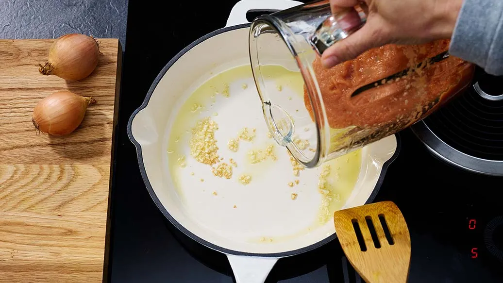 Aqueça o azeite num tacho em lume médio. Adicione o alho picado e refogue até ficar aromático. Adicione o puré de legumes do passo 1, tape e cozinhe em lume médio-baixo durante aproximadamente 15 minutos.
