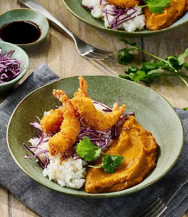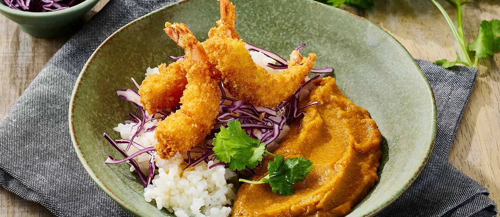 Camarão panko e caril japonês rico em umami