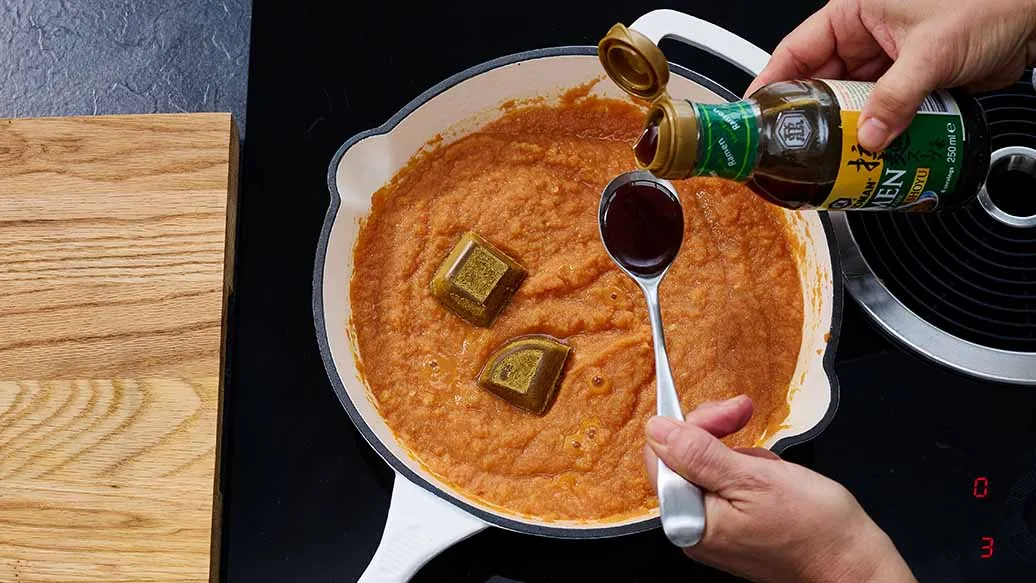 Adicione o roux de caril e mexa até dissolver completamente. Adicione a Base para Sopa Ramen Kikkoman.