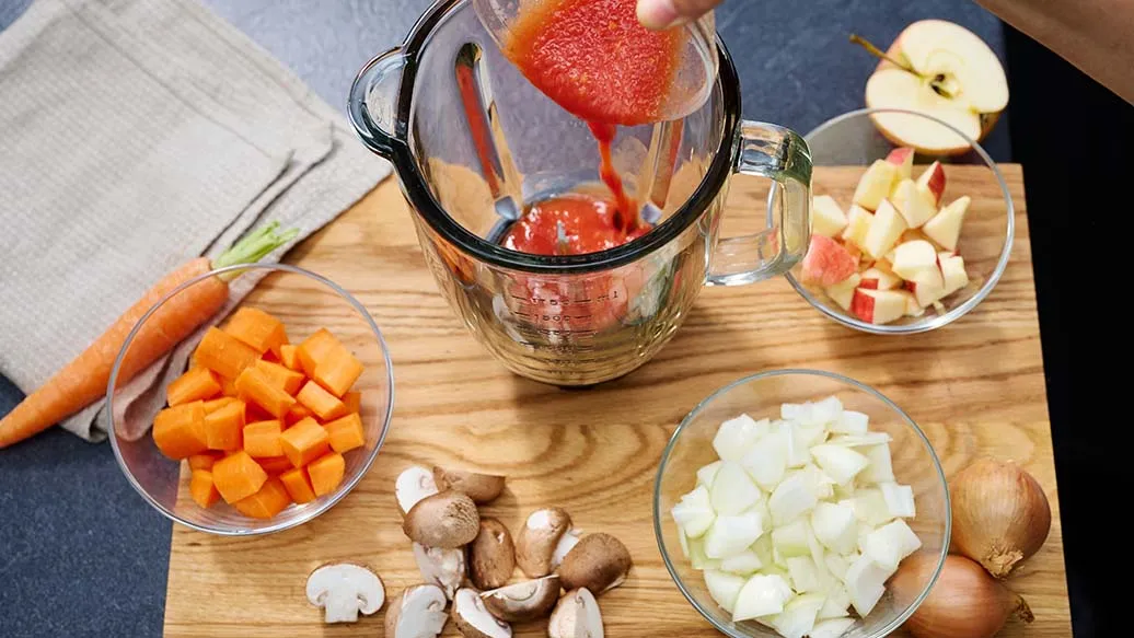 Pique grosseiramente a cebola, a cenoura, os cogumelos e a maçã. Com uma varinha mágica, liquifique juntamente com os tomates enlatados até ficar completamente homogéneo.