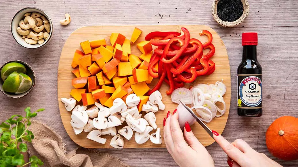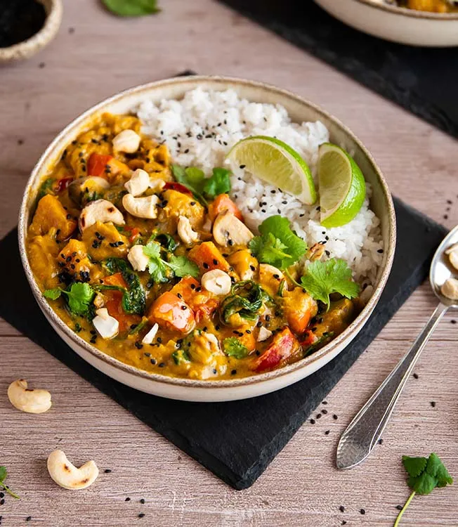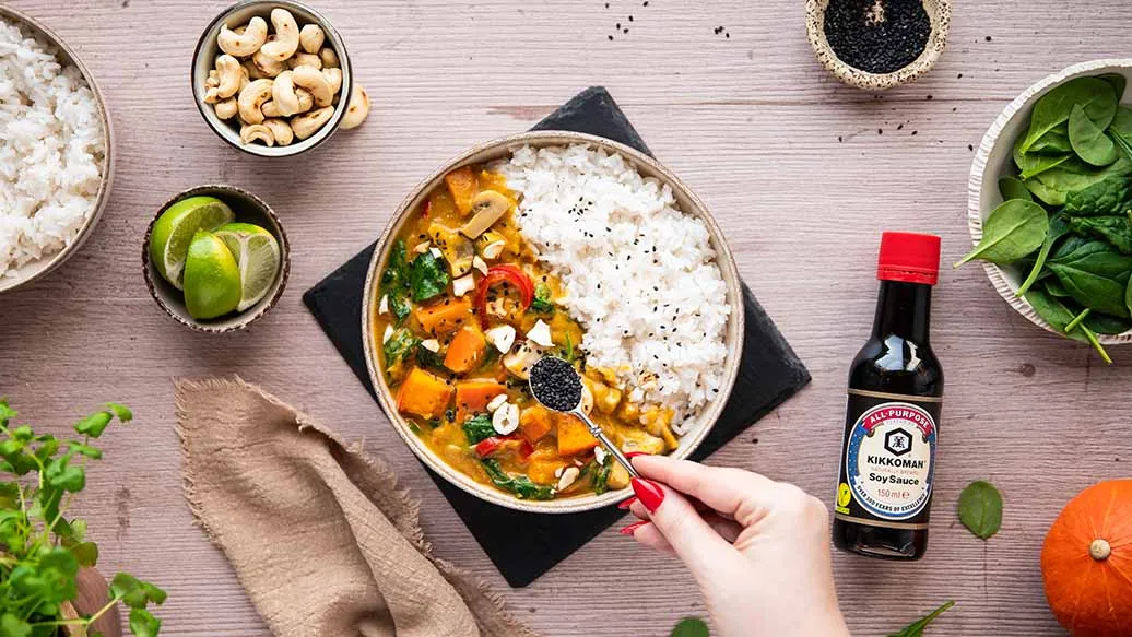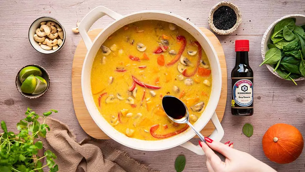 Um caril verde vegan suave com abóbora, espinafre e cogumelos. O leite de coco confere-lhe profundidade, enquanto o Molho de Soja Kikkoman acrescenta umami. Leve, mas saciante e fácil de preparar.