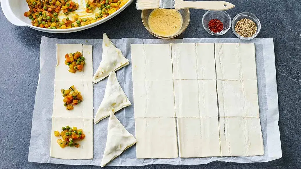 Pré-aqueça o forno a 200˚C e forre um tabuleiro com papel vegetal. Estenda a massa folhada, corte-a em 15 quadrados de tamanho uniforme (dependendo do tipo de massa) e coloque cerca de 1 colher de chá pequena de recheio no centro de cada quadrado. Dobre cada um deles num pequeno triângulo. Em alternativa: Corte 4 círculos de cerca de 12 cm de diâmetro e corte-os ao meio. Dobre a massa restante em mais 2 círculos e corte-os também ao meio. Forme cones com as metades da massa, encha com cerca de 1 colher de chá pequena de recheio e feche bem o bordo superior. Distribua as chamuças no tabuleiro de ir ao forno. Bata a gema de ovo e pincele as chamuças. Polvilhe com as sementes de sésamo e os flocos de malagueta e leve ao forno pré-aquecido durante cerca de 20 minutos até ficarem douradas. As chamuças são ideais quentes ou frias.
