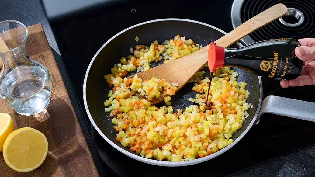 Descasque as batatas e a cenoura, lave, corte em cubos pequenos com a cebola e frite no óleo aquecido. Deglaceie com o molho de soja Kikkoman, cerca de 3 colheres de sopa de água e o sumo de limão. Cozinhe em lume brando, sem tampa, durante cerca de 10 minutos, mexendo regularmente.