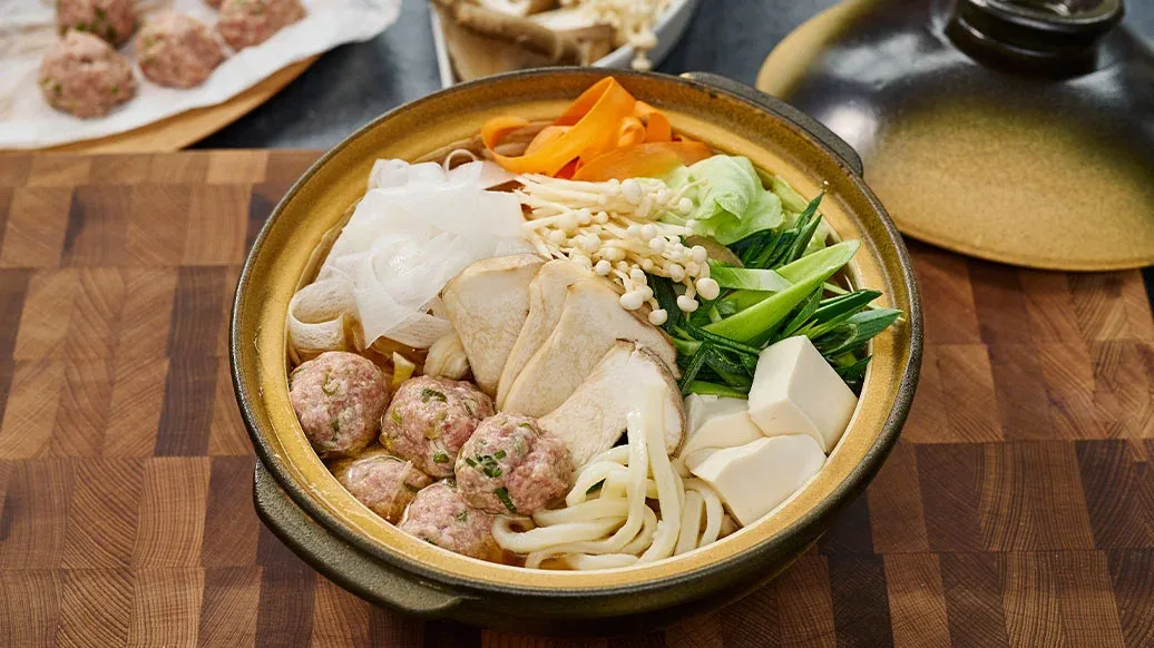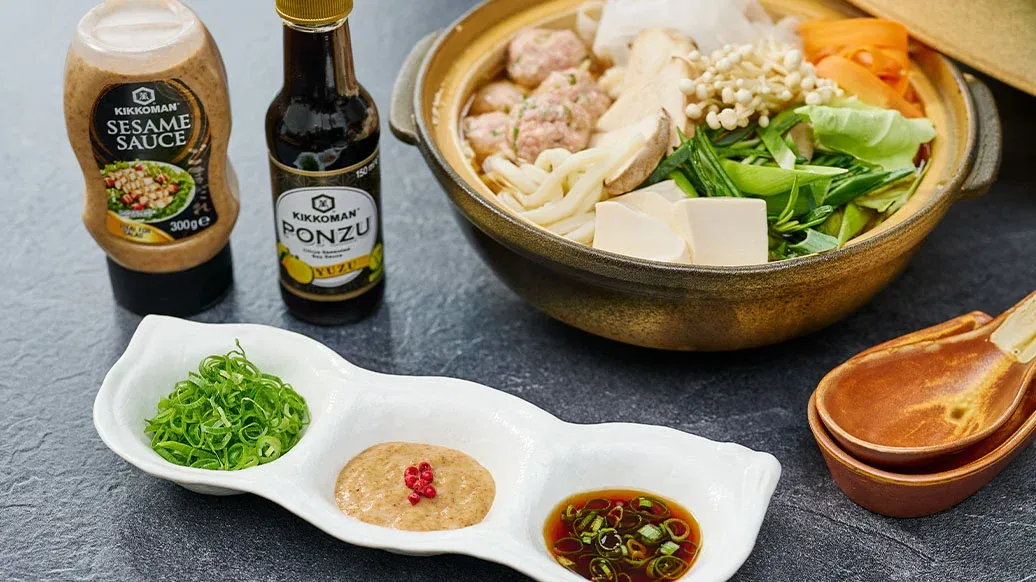 Em tempos servido nas arenas de sumo para dar força e resistência aos lutadores japoneses, este caldo nutritivo contém almôndegas de tofu, legumes frescos e noodles, temperado com Base de Sopa Ramen Kikkoman e Óleo de Sésamo Kikkoman, e servido com molhos.