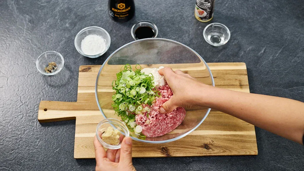 400 g de carne picada, qualquer tipo – 100 g de tofu – 1 colheres de sopa Kikkoman Molho de Soja Fermentado Naturalmente – 1 colheres de chá Kikkoman Tempero de cozinha doce ao estilo Mirin – 2 colheres de chá de gengibre ralado – 3 cebolinhas bem picadas – 2 colheres de sopa de farinha de milho – Uma pitada de pimenta preta