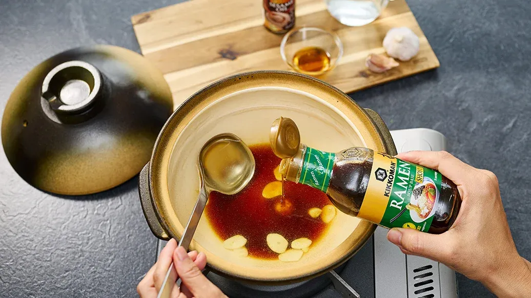 800 ml de água – 4 colheres de sopa Kikkoman Base de Sopa Concentrada de Massa de Ramen - Sabor Shoyu (Molho De Soja) – 2 colheres de chá Kikkoman Óleo de Sésamo Tostado – 1 dente de alho fatiado