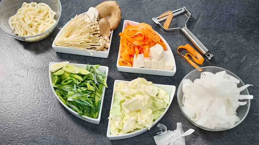 400 g de couve chinesa (½ couve) – 1 alho francês – 200 g de rabanete daikon – 150 g de cenoura – 150 g de cogumelos (por exemplo, shiitake, enoki) – 200 g de tofu