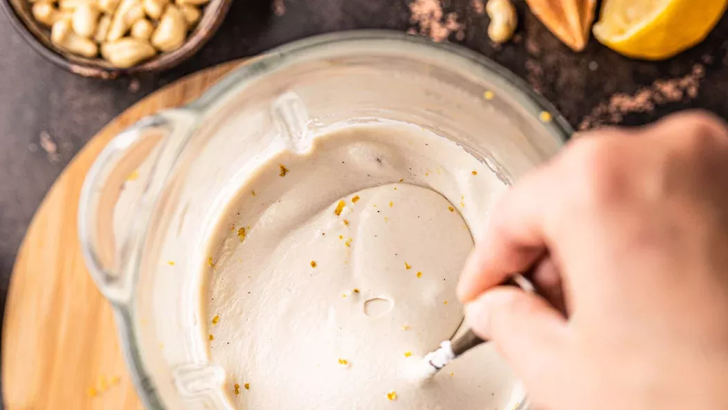 Depois, transfira os cajus para um liquidificador, adicione o creme de coco, o xarope de agave, o óleo de coco, o sumo de 1 limão e o extrato de baunilha. Misture até obter uma mistura homogénea. Adicione a raspa de limão e misture. Verta a mistura sobre a crosta preparada. Coloque-a no frigorífico para endurecer durante algumas horas.
