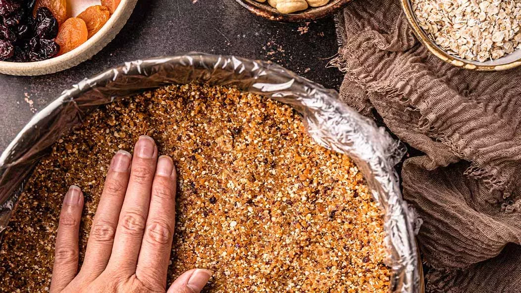Misture todos os ingredientes para a crosta até obter uma massa espessa e pegajosa.