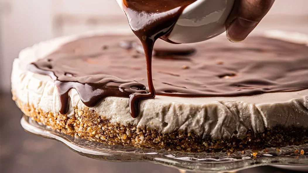 O cheesecake pode ser vegan? Sem dúvida! Os cajus funcionam na perfeição para este efeito. Experimente o "cheesecake" sem cozedura feito de cajus numa base de nozes ligeiramente salgada, regado com uma cobertura de chocolate e caramelo, enriquecida com molho de soja Kikkoman fermentado naturalmente.
