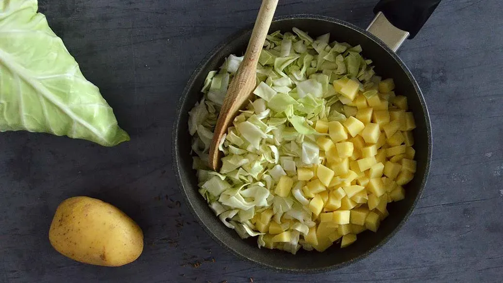 Quando o aroma a alho se libertar do tacho, adicione os cominhos, as batatas, a couve e o atum. Em seguida, adicione a água, tape e deixe cozinhar até as batatas estarem prontas (cerca de 3 minutos). Retire a tampa, adicione o caril e o garam masala em pó e o molho de soja Kikkoman, e cozinhe até que tudo se misture. Em seguida, sirva nos pratos.