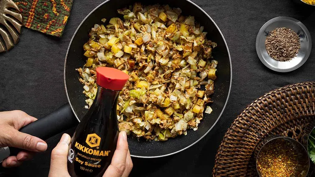 1 colheres de chá de sementes de cominho – 1 lata de atum (80 g) – 2 colheres de sopa de água – 2 colheres de chá de caril em pó – 2 colheres de chá de garam masala – 2 colheres de sopa Kikkoman Molho de Soja Fermentado Naturalmente