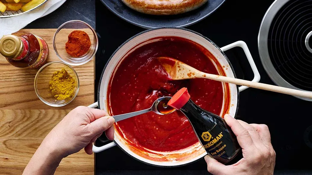 Frite as salsichas no óleo aquecido de todos os lados durante 8-10 minutos até ficarem douradas. Tempere o molho de tomate com o Molho de Soja Kikkoman, o caril em pó, a paprica em pó e o Molho Kikkoman Kimchi Chili. Corte a salsicha em fatias, adicione ao molho, aqueça brevemente e sirva com as batatas fritas e a maionese Kikkoman Ponzu Limão.