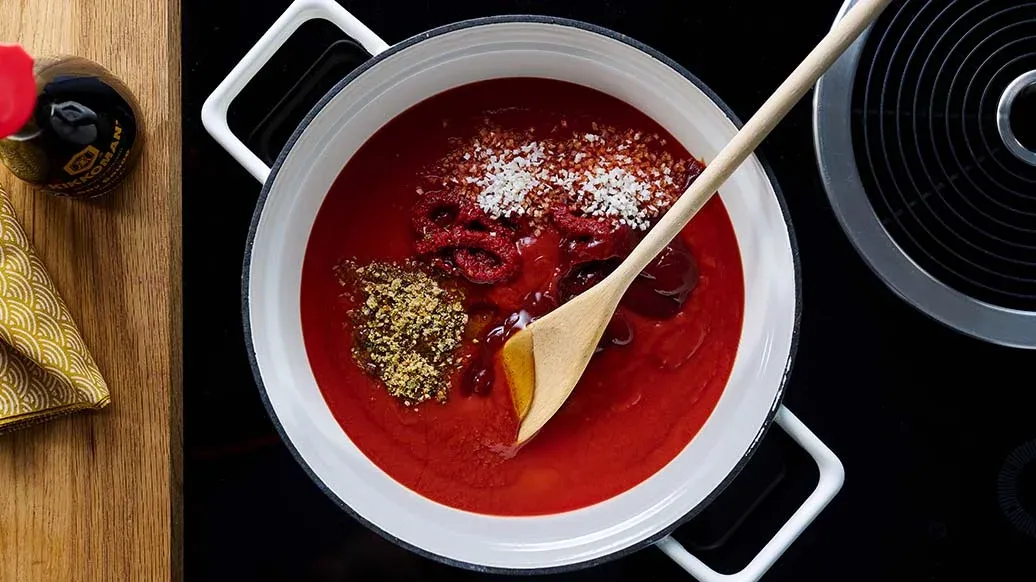 500 g de tomates coados (em lata) – 2 colheres de sopa de polpa de tomate – 3 colheres de sopa de ketchup – 2 colheres de chá de mel (ou xarope de ácer, ou tempero de cozinha doce Kikkoman Mirin) – 1 colheres de chá de legumes granulado – 2 colheres de chá de cebola granulada (ou 1 cebola pequena picada)