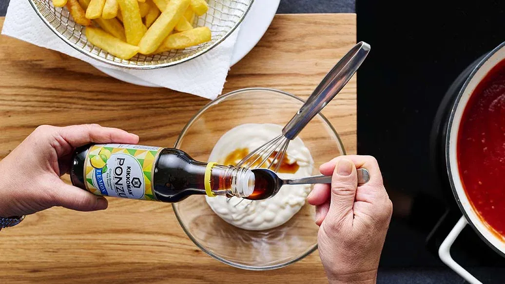Prepare as batatas fritas de acordo com as instruções da embalagem. Misture a maionese com o Kikkoman Ponzu Limão.