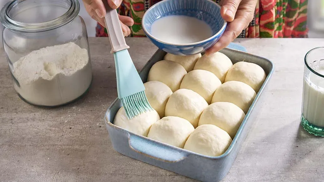 Aqueça 120 ml do leite a 38 °C e misture com o açúcar e o fermento. Adicione gradualmente a 170 g da farinha e misture até formar uma massa. Derreta e adicione 5 g da manteiga e amasse por cerca de 10 minutos. Divida em 12 bolas e coloque numa assadeira untada com os 10 g restantes de manteiga derretida. Cubra e deixe crescer por 40 minutos. Em seguida, pincele bem a parte superior com os 20 ml restantes de leite e asse a 180 °C por 20 minutos até que a parte superior fique dourada. Sirva o dal com os pãezinhos pav e decore com as malaguetas fatiadas.