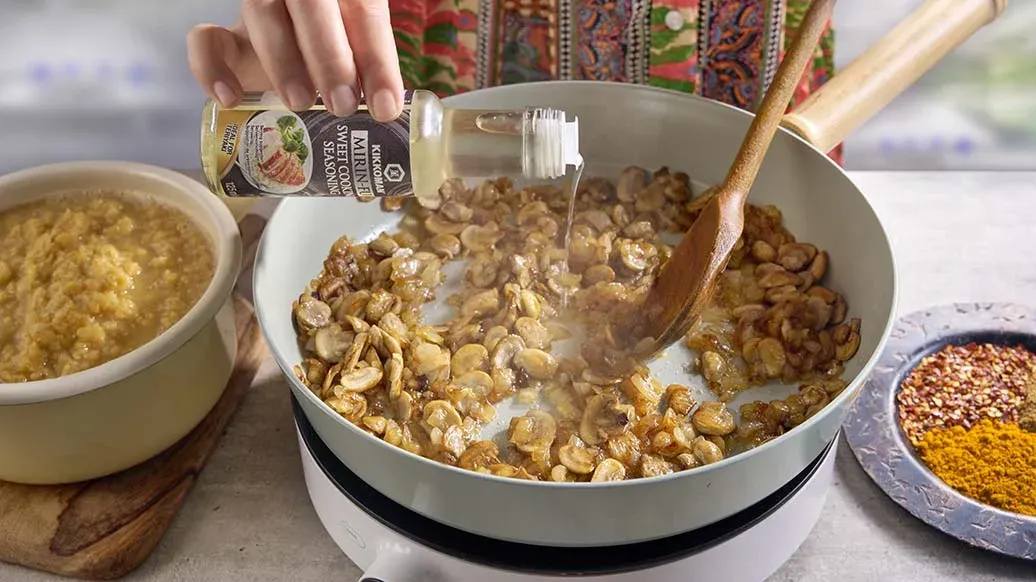 Cozinhe as lentilhas no caldo de legumes durante 10 minutos. Caramelize a cebola e os cogumelos na manteiga clarificada durante 10 minutos até ficarem dourados, depois adicione o tempero doce estilo mirin Kikkoman e refogue durante 1 minuto. Adicione os cominhos, a curcuma e os flocos de malagueta e frite durante 10 segundos para libertar os aromas. Junte as lentilhas e cozinhe durante 5 minutos.
