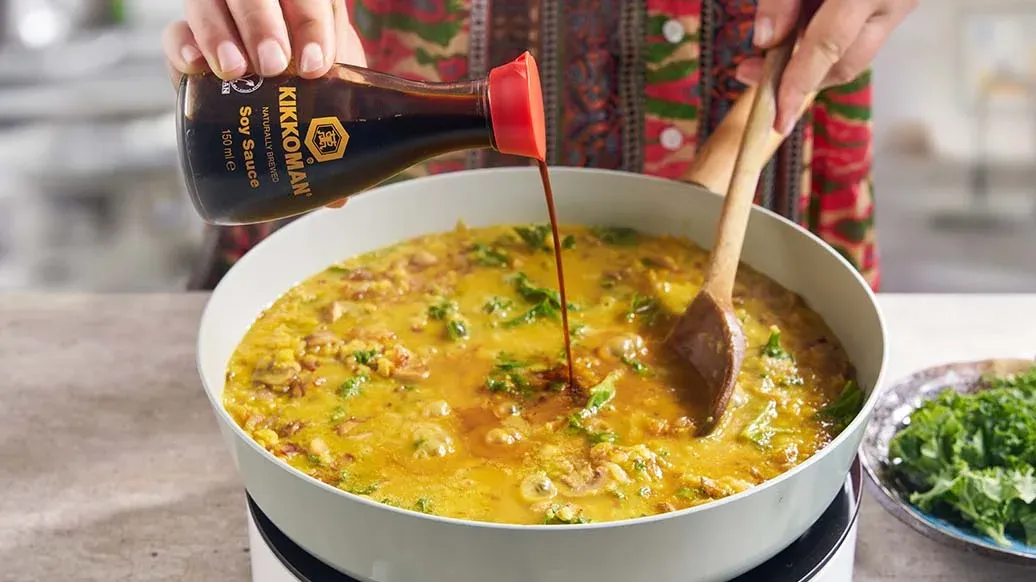 Um dal de lentilhas vermelhas com cebola caramelizada, cogumelos e especiarias reconfortantes, enriquecido com Molho de Soja Kikkoman e Tempero Doce Estilo Mirin Kikkoman. Servido com pãezinhos pav macios e malagueta fresca para um equilíbrio perfeito entre o sabor intenso e a doçura subtil.